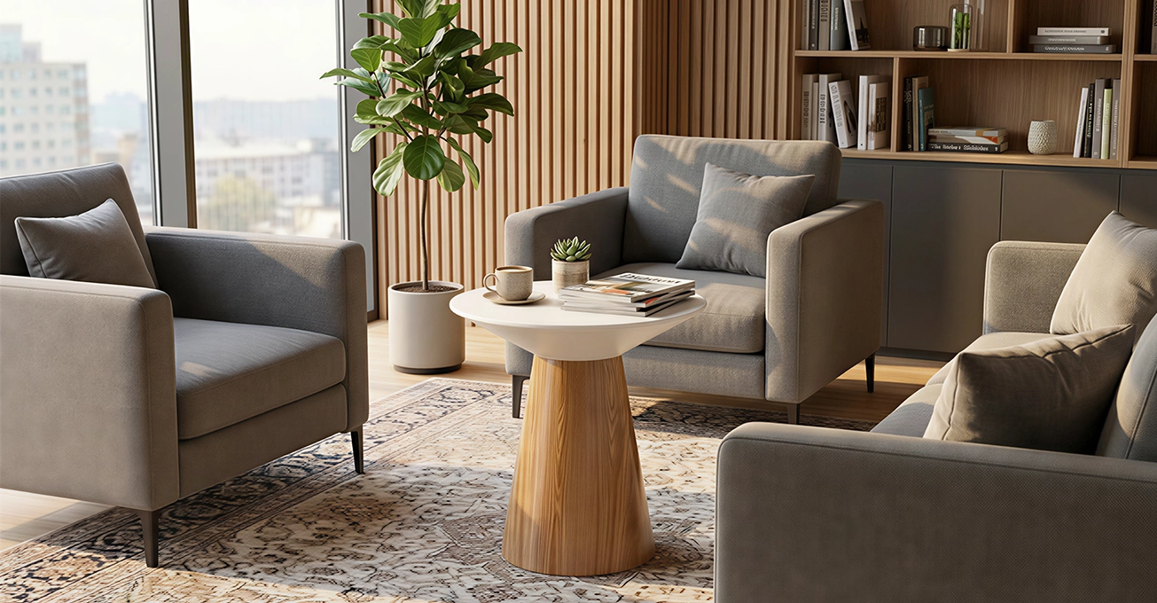 Commercial Use: It is ideal for office lobbies or waiting areas. Therefore, the Round Pedestal Coffee Table impresses clients immediately.