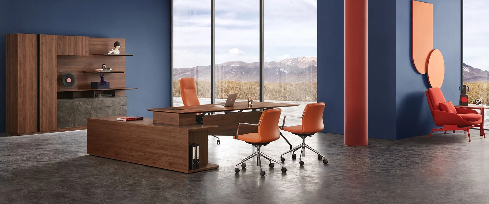 The Sweeney L-shaped executive office desk, a highlight in modern executive office furniture sets, features sturdy 1.7mm steel tube legs and frame, paired with a rich wooden top. Combined with a spacious side cabinet, it offers both elegance and functionality, making it a perfect high end executive desk for upscale workspaces.