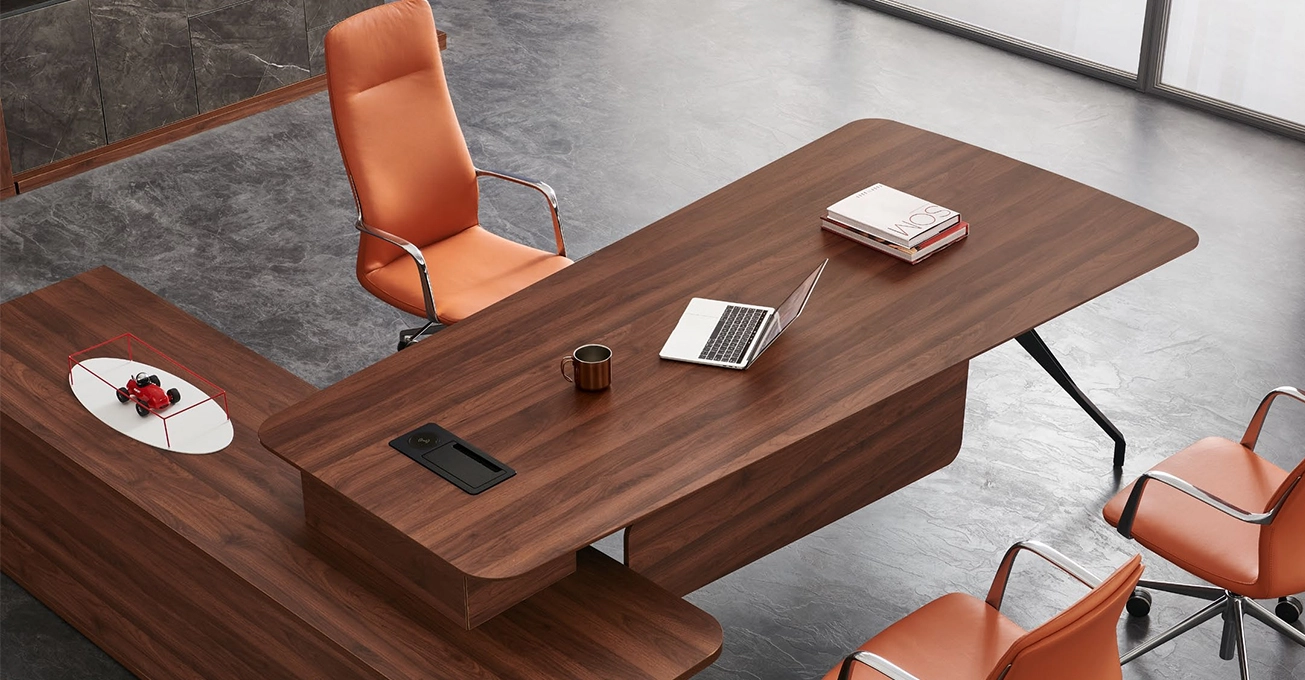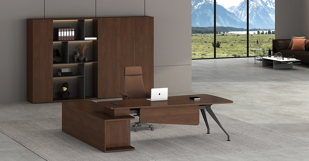 The Sweeney L-shaped executive office desk, a highlight in modern executive office furniture sets, features sturdy 1.7mm steel tube legs and frame, paired with a rich wooden top. Combined with a spacious side cabinet, it offers both elegance and functionality, making it a perfect high end executive desk for upscale workspaces.