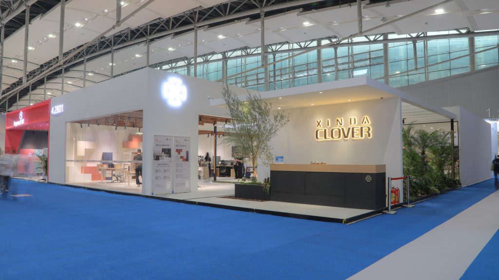 Xinda Clover is a manufacturer with more than 36 years of professional experience in office furniture. We possess strong production capacity, design capabilities, and one-stop office furniture solution capabilities. Just as the exhibition area we are located in is named “System Furniture”, the products I will show you next include: Height adjustable table with EPO systems, metal structure staff workstations, screen workstations, modular filing cabinets, movable partitions, soundproof office pods, glass partitions, executive desk combinations, conference tables, sofas, office chairs and other series of products.