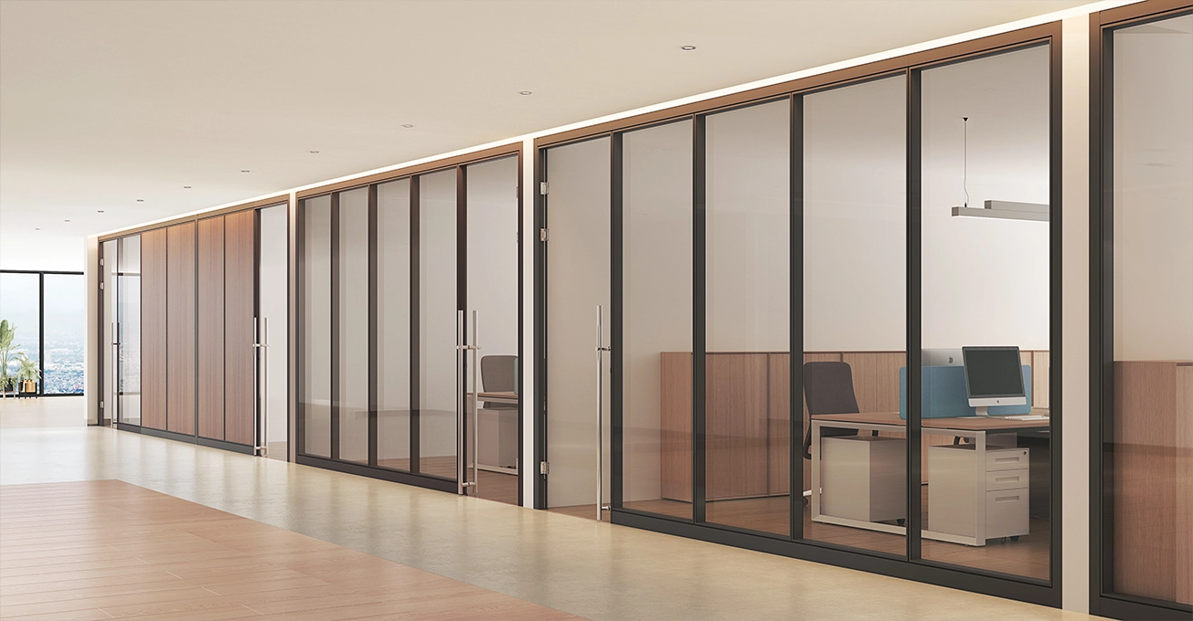 HK85 partition wall system features robust 1.5-2mm aluminum framing, delivering exceptional structural support. Its clean linear profiles infuse spaces with contemporary elegance, while precision-engineered aluminum connections ensure uncompromising durability.